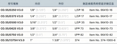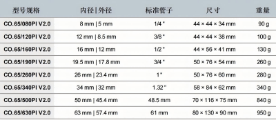 2、SONOFLOWCO.55V3.0各型号对应管子内外径尺寸