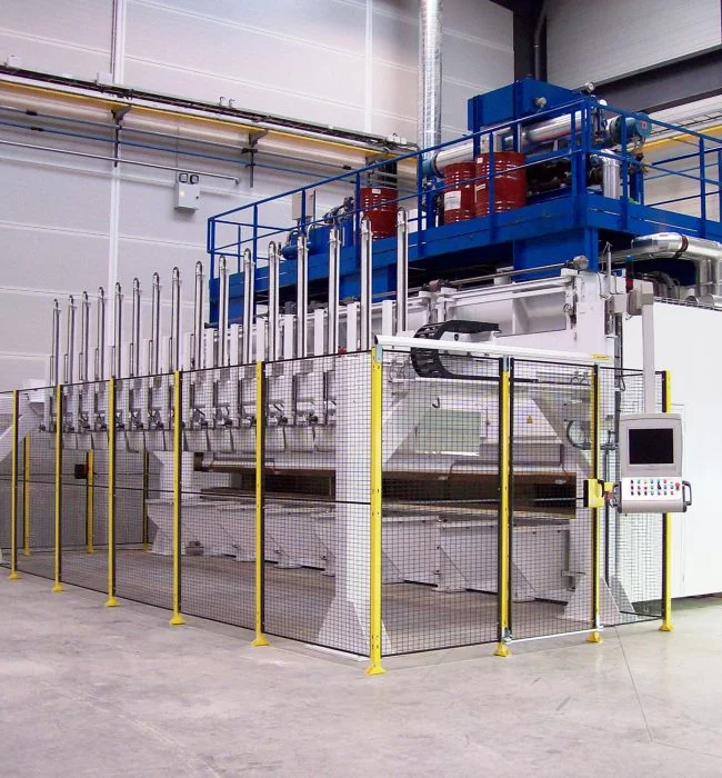 - 热成型压机生产线:压机最大压力 40,000kN,可处理热固性毡制噪音吸收材料、发动机舱玻璃纤维隔音材料;含材料放卷与裁切单元(自动换卷防中断),热固性材料配资质认证供应商加热模具(完成聚合),热塑性复合材料设预热站,配备蒸汽 / 热空气喷射 / 电加热方式,拥有专有软件驱动的自动卸料系统。