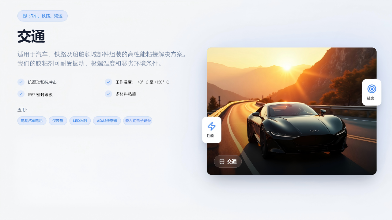 KEOL为汽车、航空航天、能源及电子等行业开发定制粘接方案,直面振动、极限温度与复杂材料带来的挑战。凭借可靠的密封性、耐久性与合规性,我们致力于成为您攻克复杂技术难关、提升产品性能的核心伙伴。