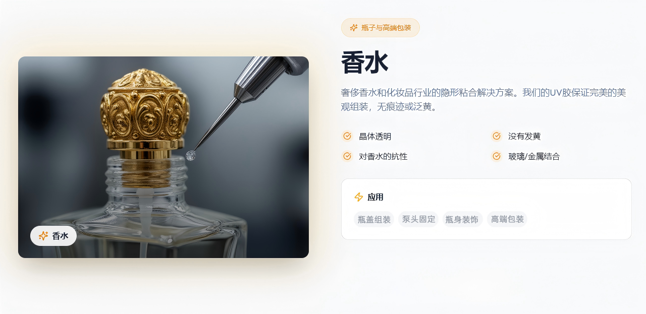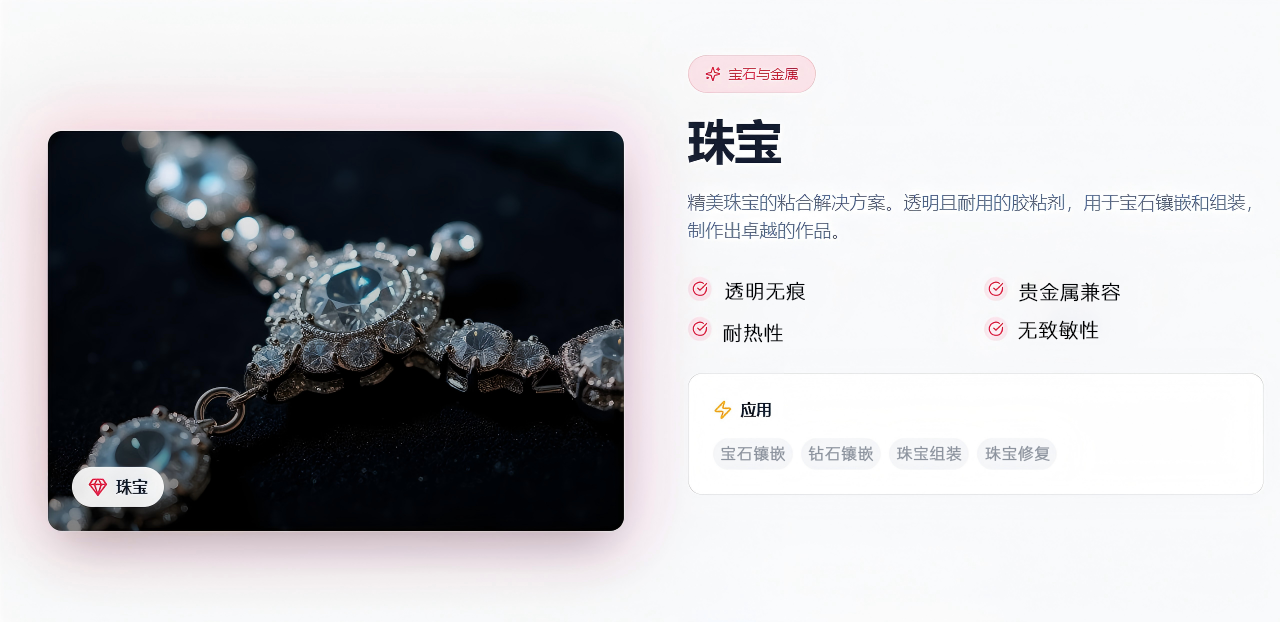 法国Keol生产的UV胶凭借其能够纳升级精度和完全隐形的特性广泛应用于珠宝领域,我们的UV胶可根据客户的具体需求做到在不同情况下都可完全隐形,且永久不会发黄。除此之外,该类胶水还抗震动,强度高等特点。Keol的UV胶在奢侈品行业的应用已获得Dior迪奥、Chanel香奈儿、Hermes爱马仕、Givenchy纪梵希、Cartier卡地亚、Bvlgari宝格丽、Estée Lauder雅诗兰黛等五十家著名奢侈品品牌认可。